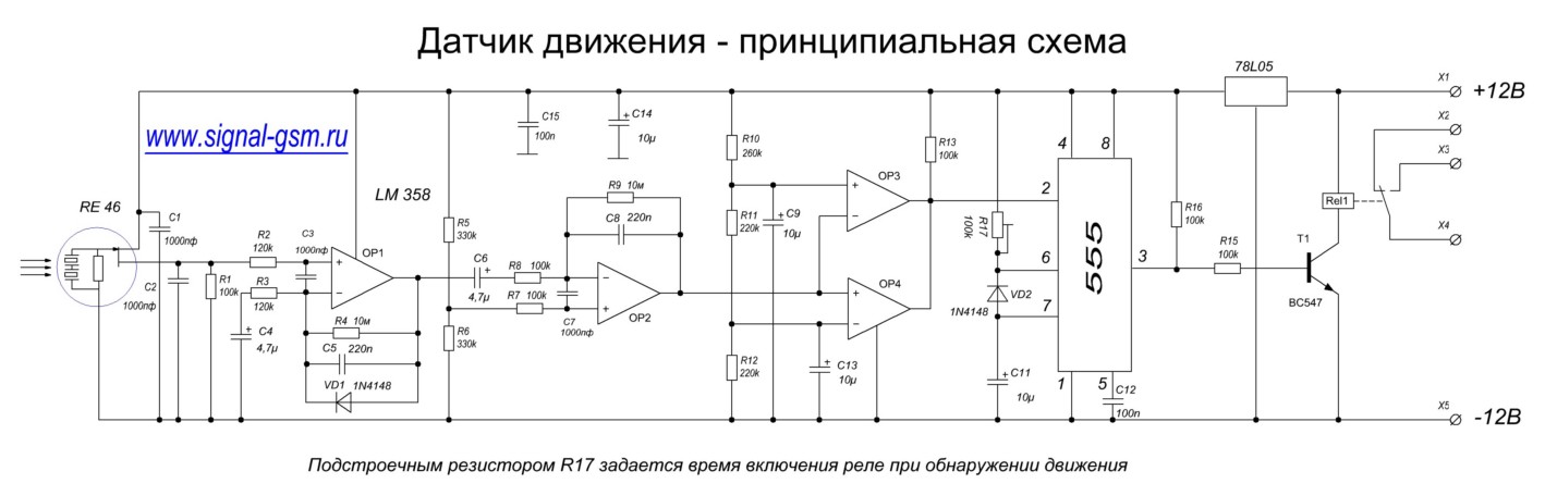 Сигнал, полученный от PIR-сенсора, усиливается усилителем, затем с помощью компаратора преобразуется в цифровой, и подается на реле, которое и формирует сигнал тревоги, путем размыкания контактов.