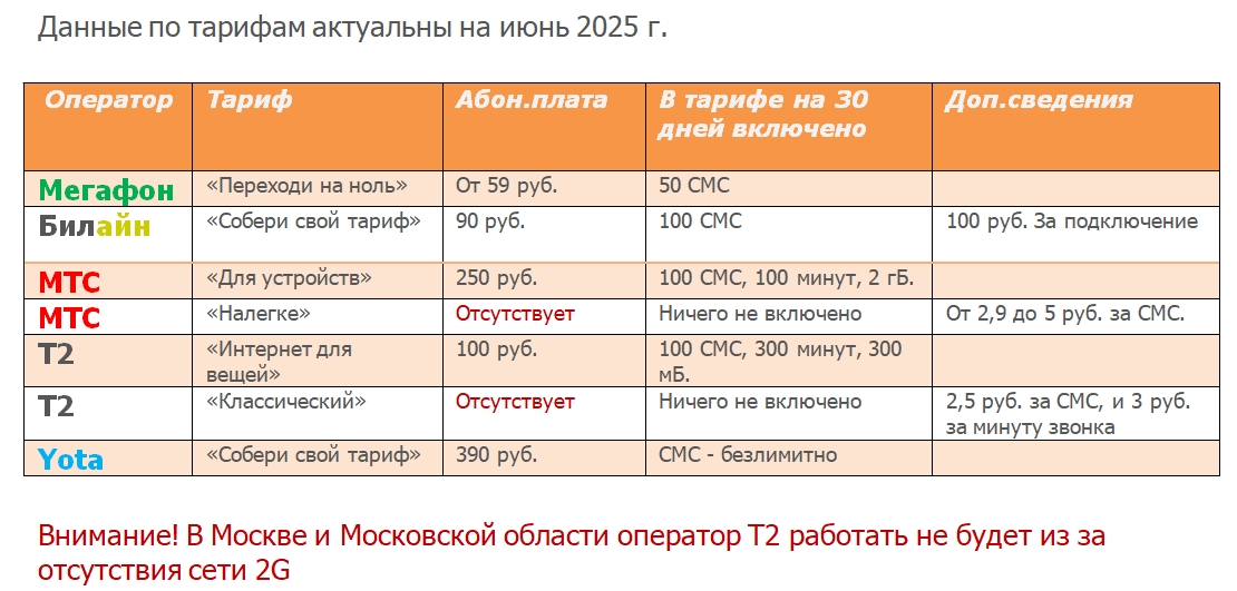 Выбрать тариф и оператора можно ориентируясь на данную таблицу